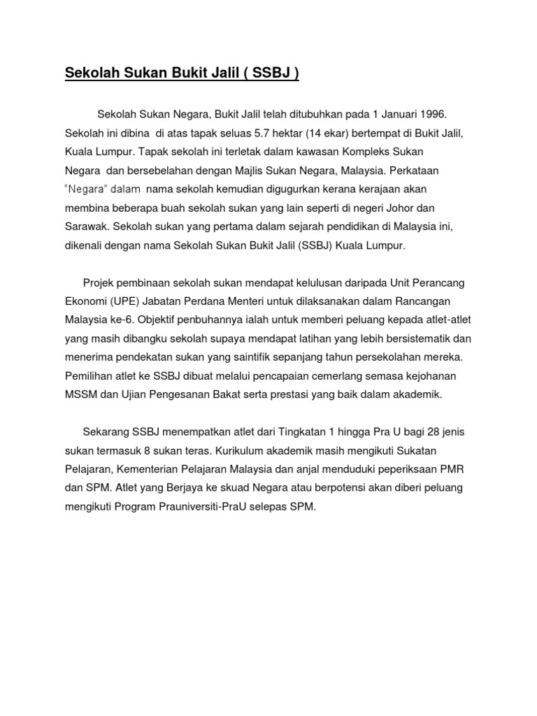 Local Business in Kuala Lumpur Malaysia. Asalamualaikumsaya muhammad alif dari melakasaya aktif dalam sukan bola sepak tetapi saya tidak pernah mewakili sekolahsaya bermain bola sepak di club saya sahajaadakah saya layak untuk memasuki sekolah sukan bukit jalilsaya ingin meneruskan karier saya sebagai seorang pemain bola sepakuntuk maklumat lanjut sila call 0166657474 bapa01123889612. SEKOLAH SUKAN BUKIT JALIL SSBJ PENGENALAN Perancangan penubuhan Sekolah Sukan Malaysia telah diluluskan dalam Rancangan Malaysia Ke-5 1991-1995.